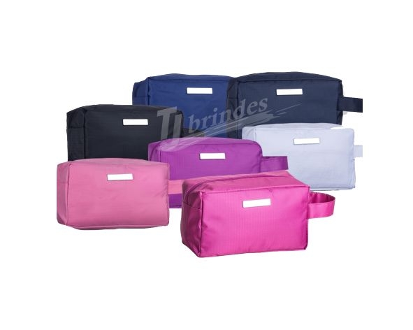 Necessaire impermeável de pvc com plaquinha metálica para personalização, possui alça lateral, zíper e forro de poliéster.