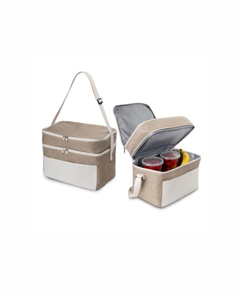 Bolsa térmica em Juta sintética e bolso em algodão. Interior costurado revestido em PEVA (Polietileno vinil acetato, alternativa ecológica ao PVC), alça de ombro ajustável e capacidade de até 14L. Possui dois compartimentos térmicos com sistema de fechamento por meio de zíper. Peso do Produto:0,210kg
