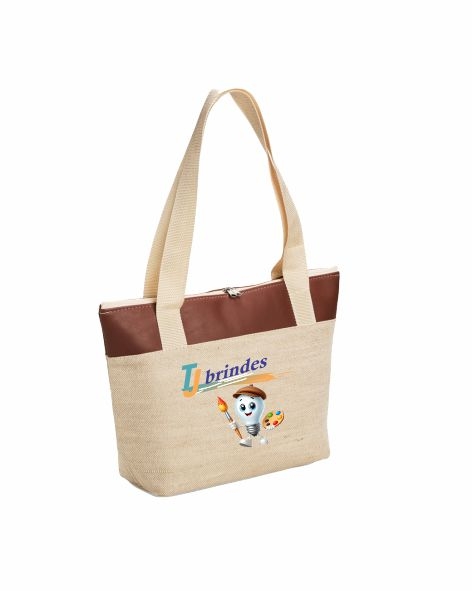 Descrição: "Bolsa térmica" confeccionada em juta e detalhe em bidim, fechamento em zíper e capacidade de até 12 litros. Possui revestimento térmico em folha de alumínio e um par de alças fixas.
